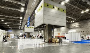 設営初日、やっぱりワクワクしますね。それにしてもこの会場の柱の上のキューブ、邪魔だなあ、、、、。